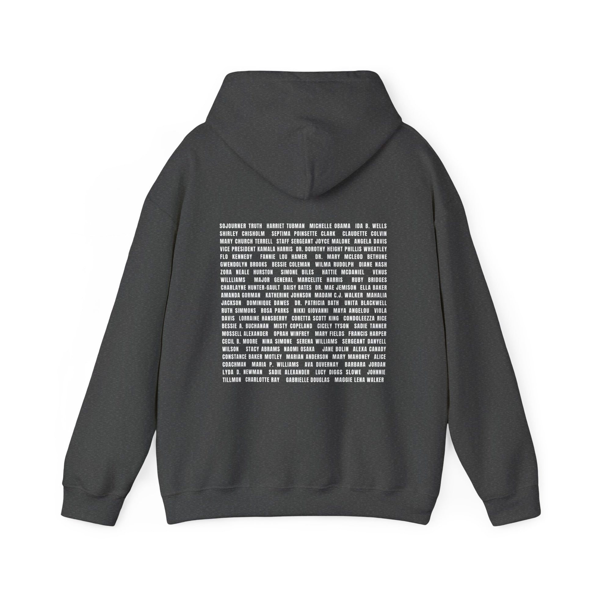 Celebrate some of the most notable, revolutionary Black women in our history with our exclusive unisex heavy blend hooded sweatshirt! It is truly relaxation itself. Made with a thick blend of cotton and polyester, it feels plush, soft and warm, a perfect choice for any cold day. In the front, the spacious kangaroo pocket adds daily practicality while the hood's drawstring is the same color as the base sweater for extra style points.