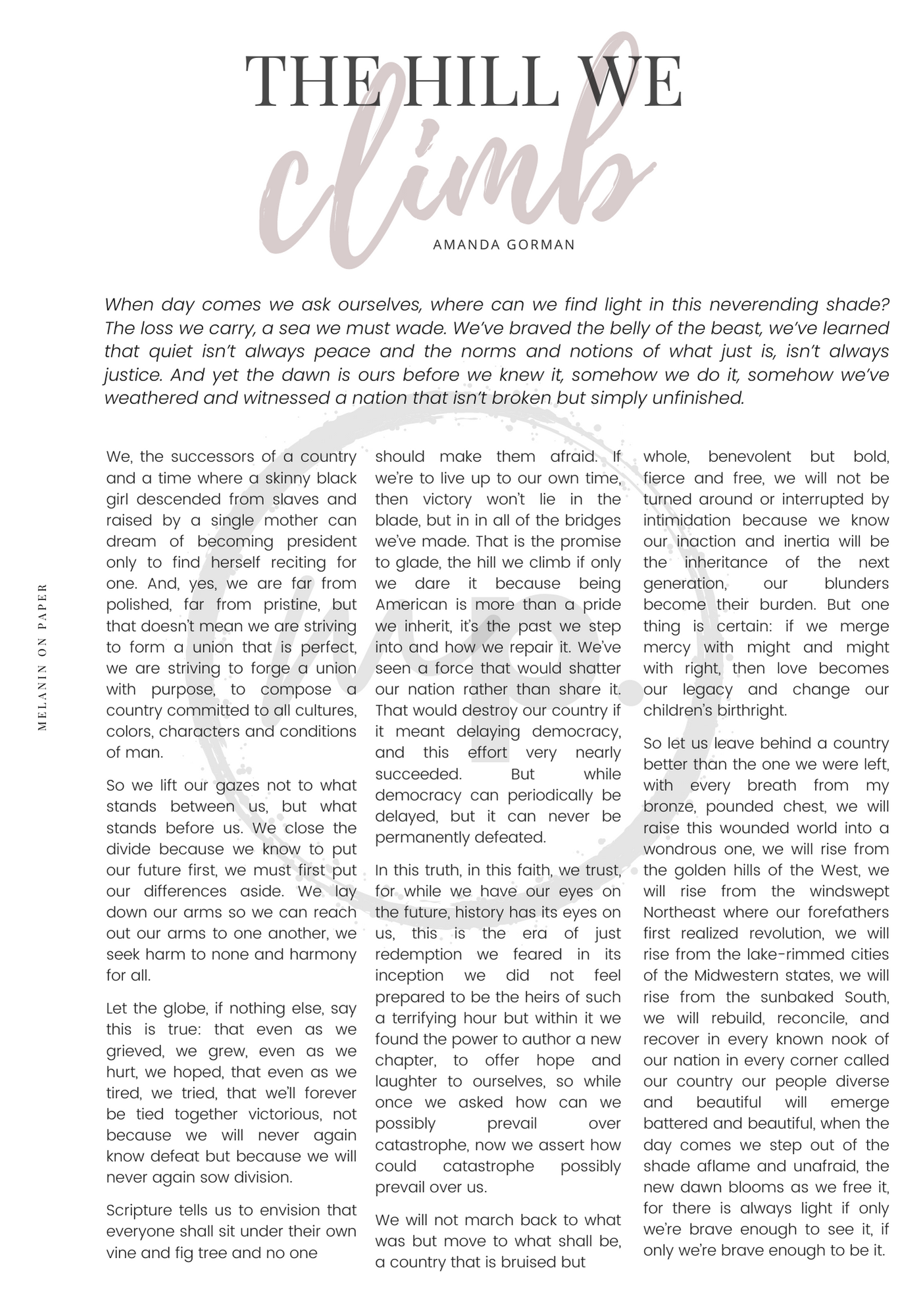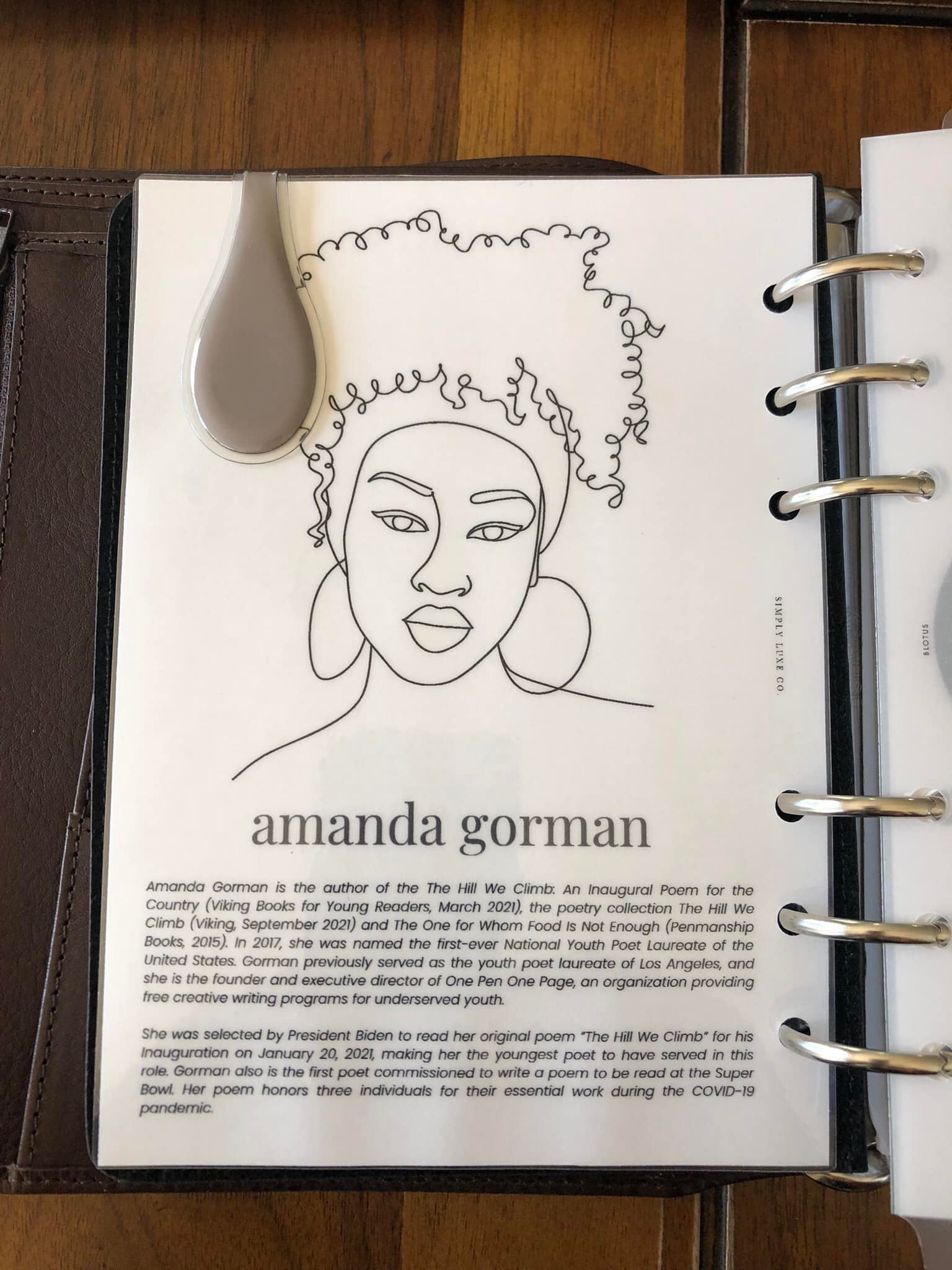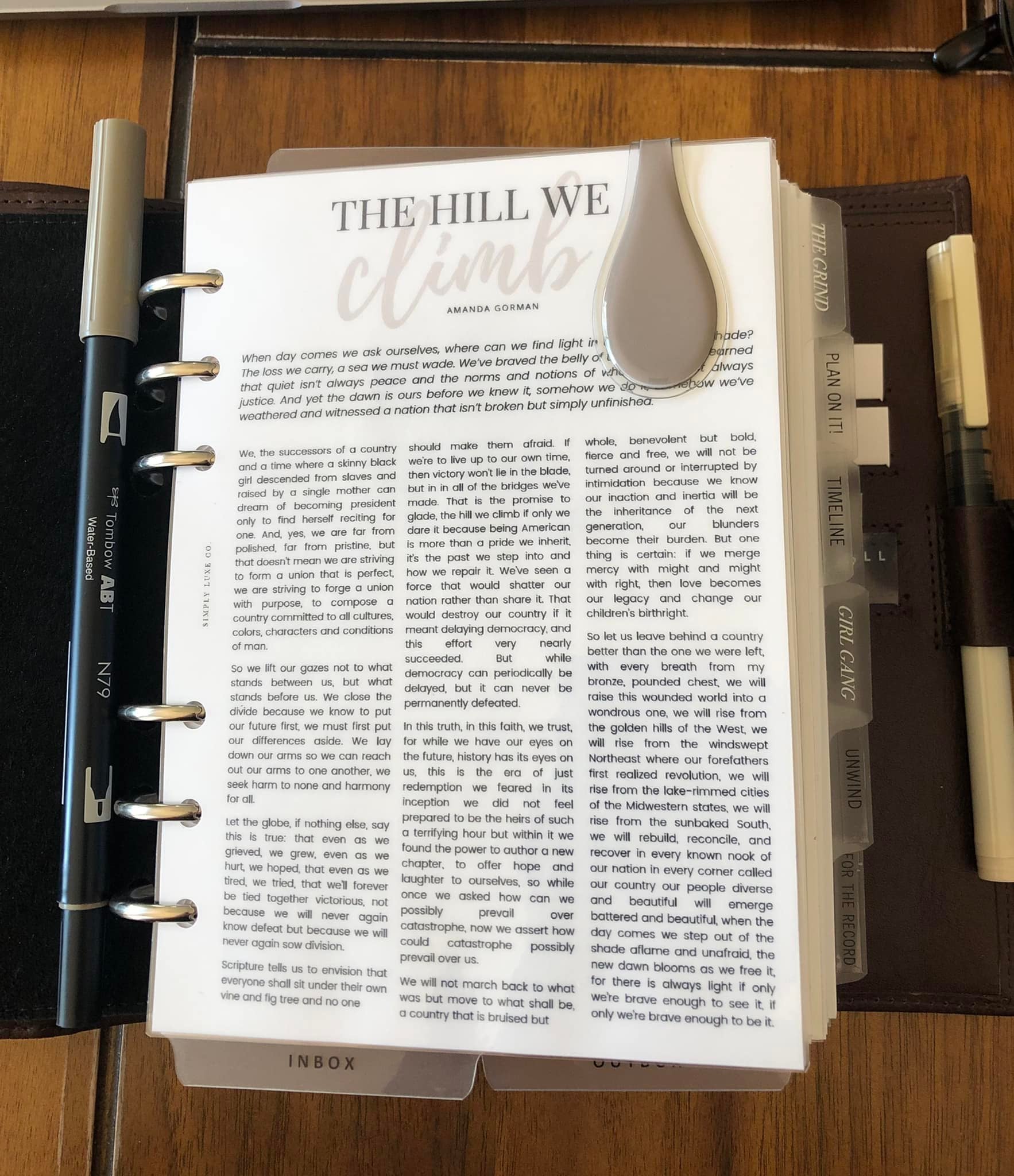 Accentuate your planner with just the right touch of motivation and aesthetic. This poem entitled “The Hill We Climb” was penned by Amanda Gorman, and she had the privilege of presenting it during the Biden/Harris Presidential Inauguration in 2021.
